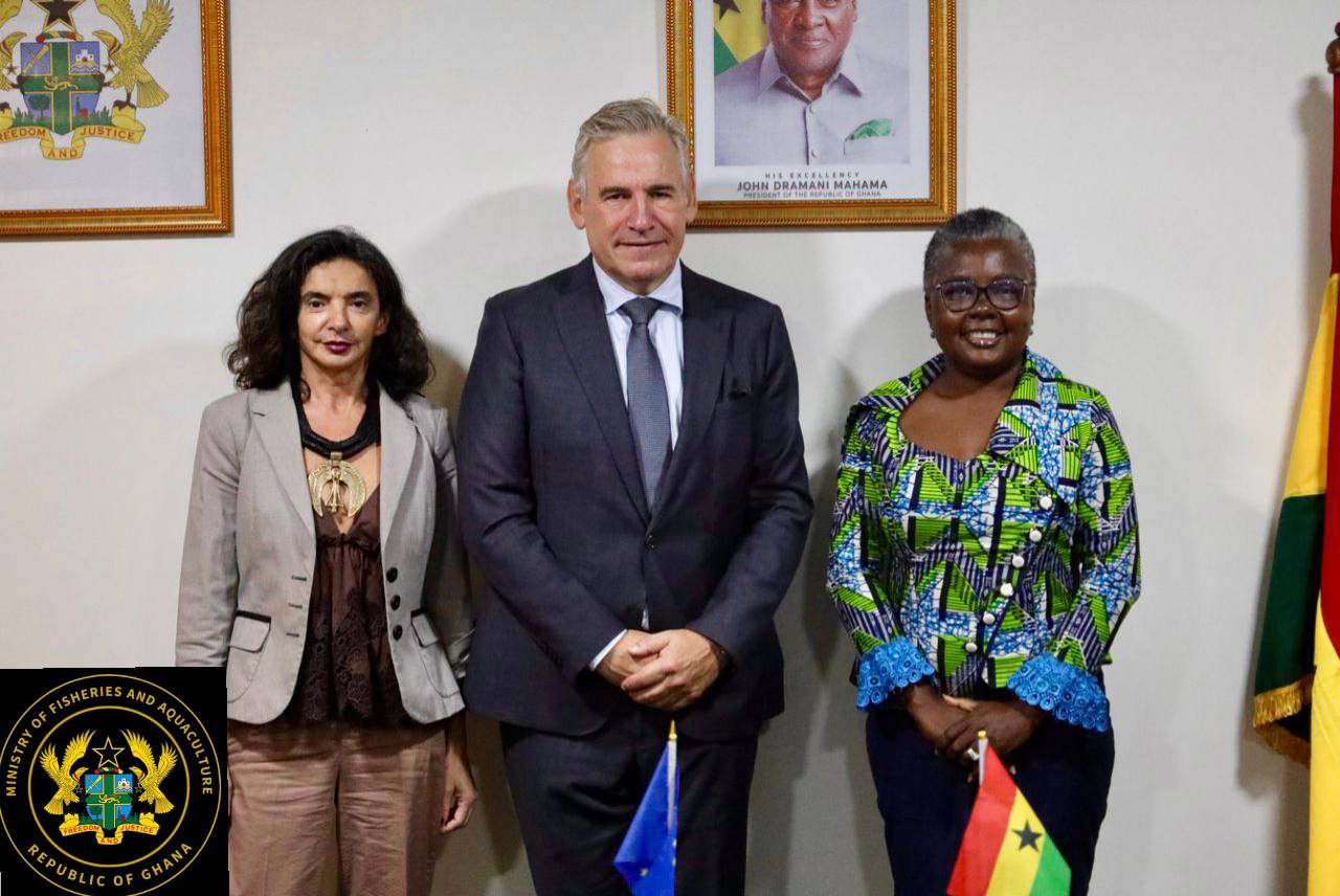 The Minister for Fisheries and Aquaculture , Hon. Emelia Arthur, has held a productive meeting with the European Union Ambassador to Ghana, His Excellency Mr. Rune Skinnebach, to review Ghana’s progress toward lifting the Illegal, Unreported, and Unregulated (IUU) fishing yellow card issued by the EU.